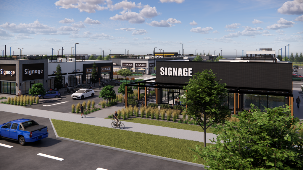 The Belmont Shopping Centre blends modern architecture, pedestrian-friendly design, and dynamic public spaces. Featuring a Main Street with dual-fronting storefronts, outdoor plazas, wide sidewalks, and high-quality landscaping, the development promotes connectivity and community interaction. Its cohesive architectural style defined by sleek, rectilinear forms, durable materials, and contemporary colour tones creates a timeless, unified appearance while allowing individual tenant expression.