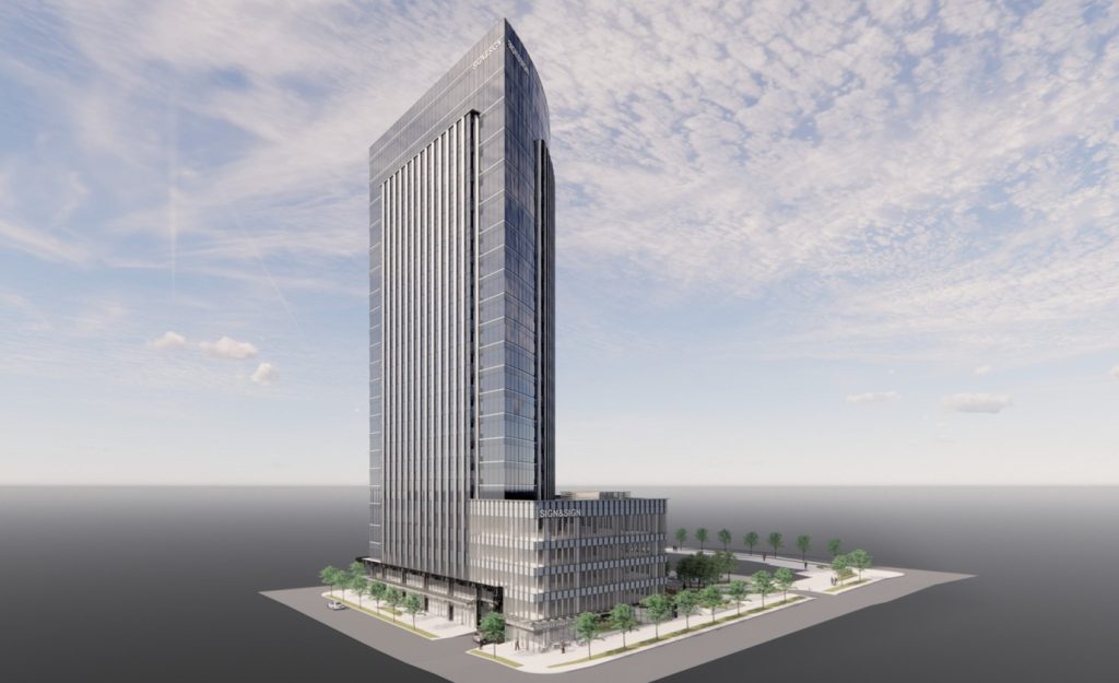 CC4 features a striking three-sided tower design, with the central portion of each façade extended outward as a bay and articulated through strong, continuous vertical convex panels.