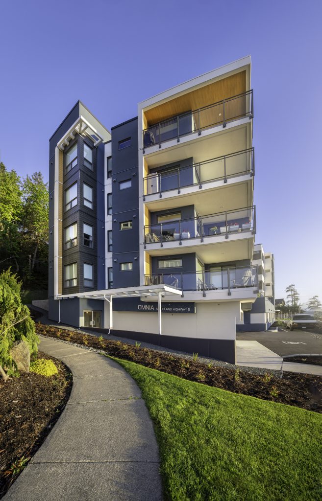 Located in Campbell River, this five-storey residential building features 24 units and is thoughtfully positioned between a highway and a steep bank at the rear. Designed with a modern West Coast aesthetic, the building maximizes ocean views while seamlessly integrating into the surrounding landscape, creating a harmonious blend of nature and contemporary living.