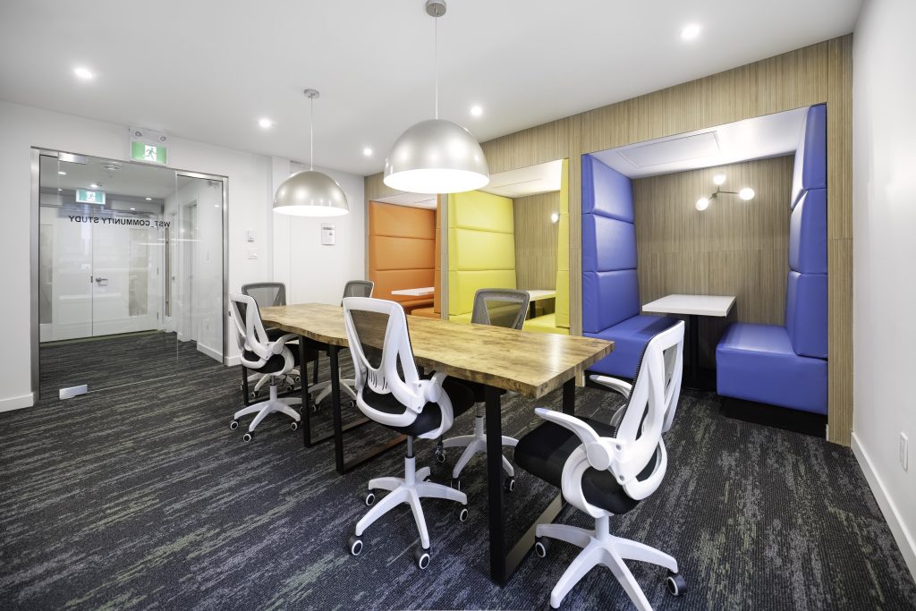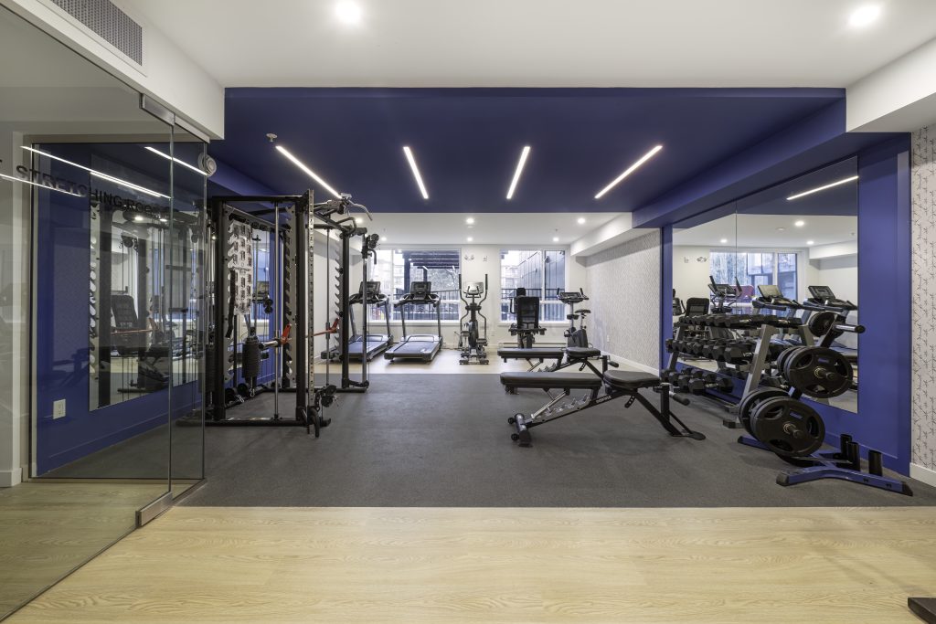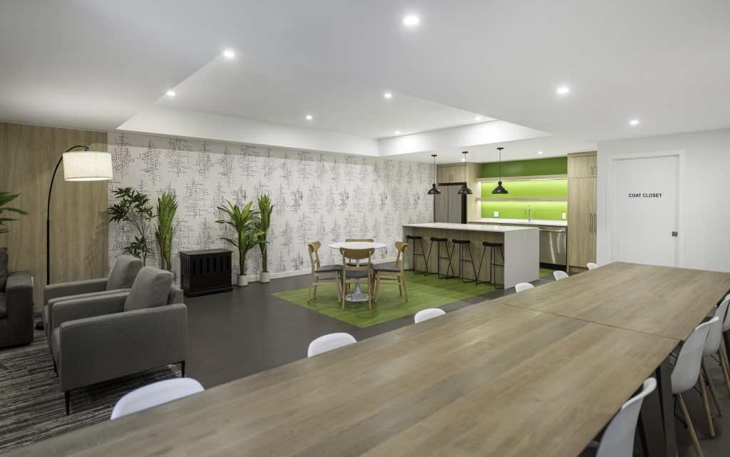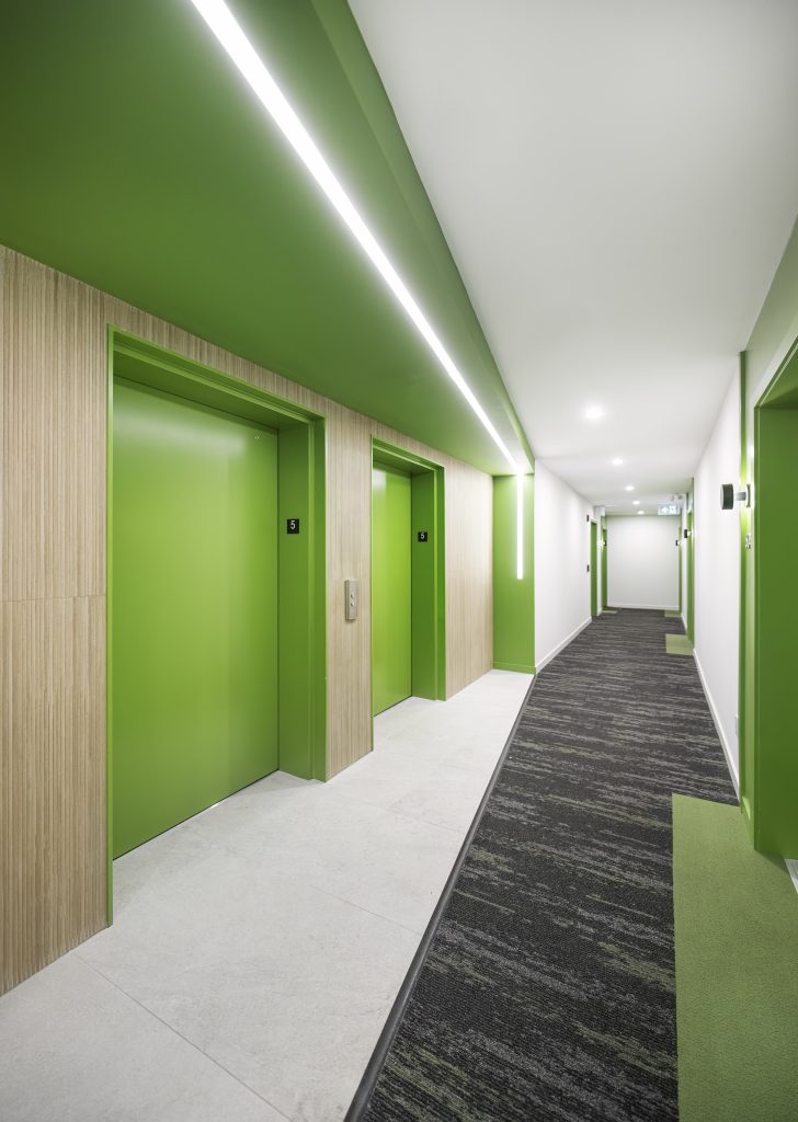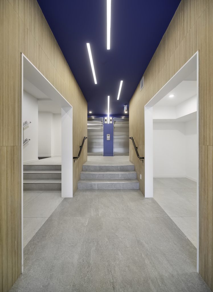 Located in Surrey, this project is a 193-unit market housing development comprised of two buildings, for which WA Architects was also the architect. The most distinctive interior design element is the buildings’ vibrant colour scheme. In the lobbies, this distinguishing feature is found in the brightly painted ceiling element which draws your eye towards the elevator. This striking colour detail, together with a warm wood-look wall tile and LED lighting, is repeated throughout. This not only creates a sense of interest and cohesion but also acts as a creative wayfinding method for the building’s occupants.