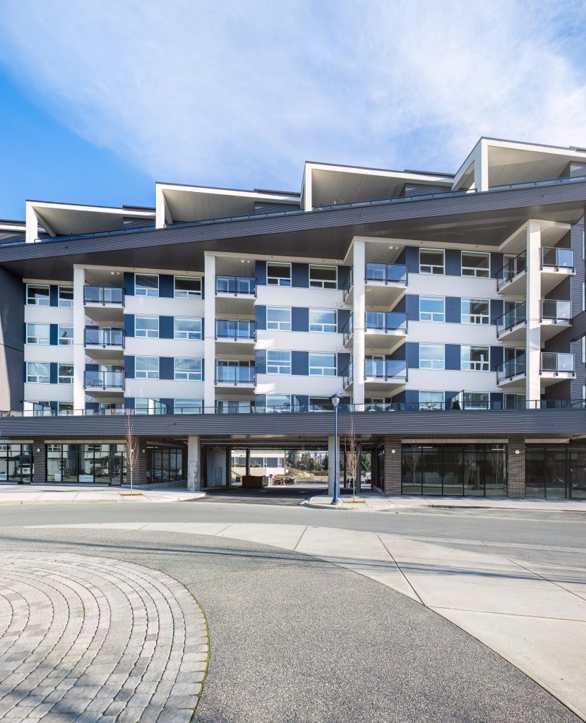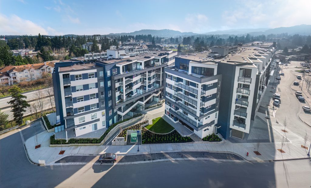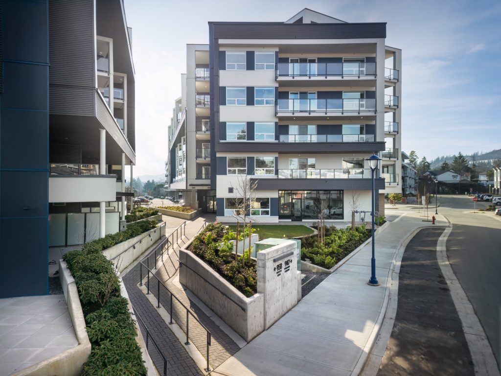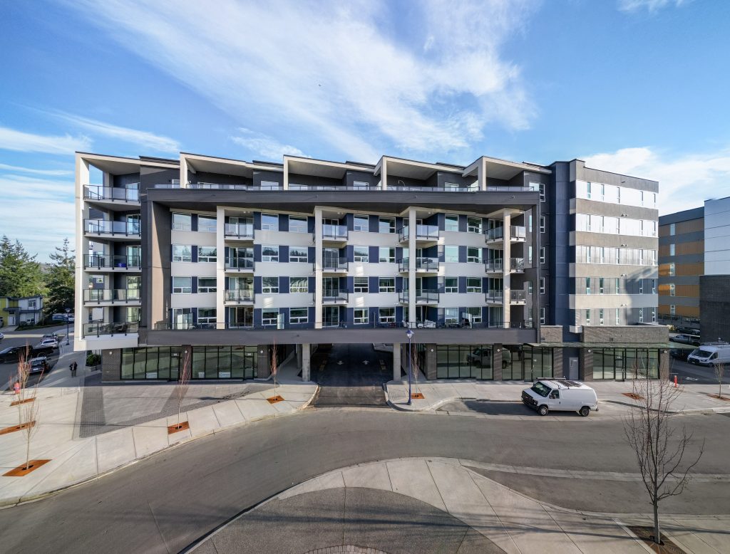This family-friendly, mixed-use development is located in North Langford, Greater Victoria. The project offers 123 modern condominiums, featuring a variety of layouts, including one-, two-, three-bedroom, and three-bedroom plus den units. Designed to meet the needs of families and individuals, this development combines comfortable living spaces with convenient community-focused amenities.