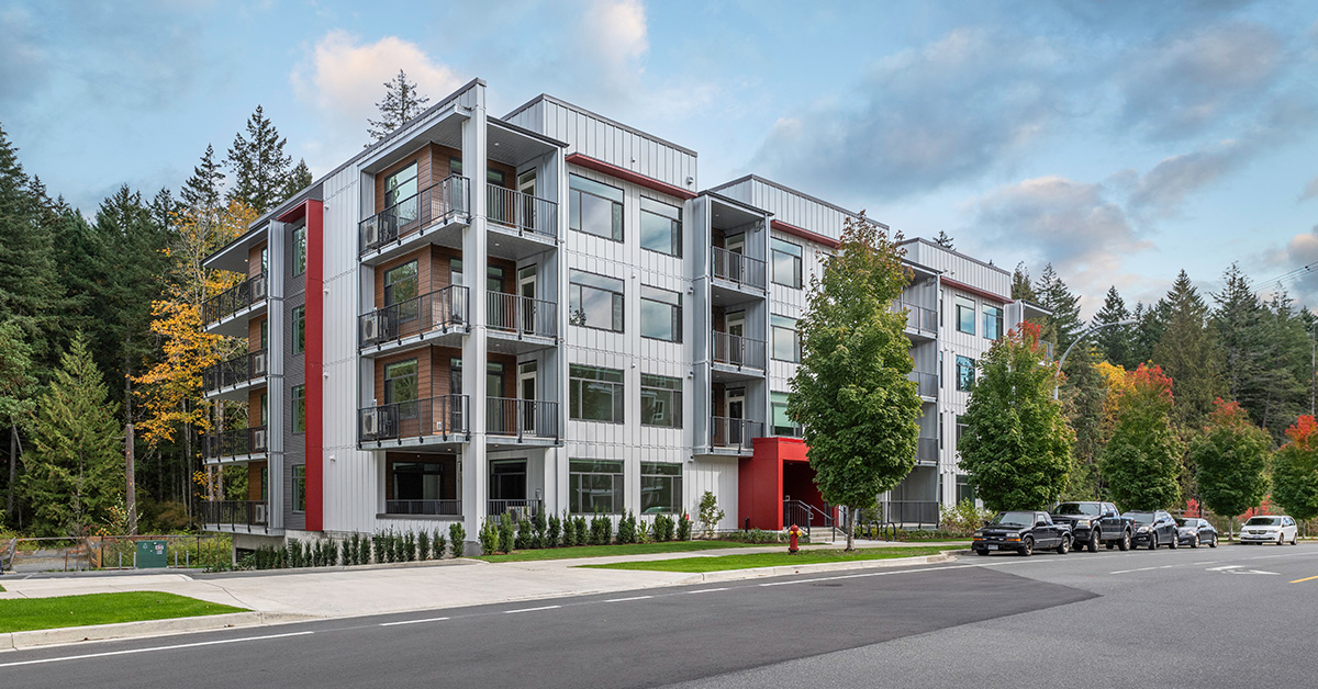 This project at 6030 Linley Valley Drive features 152 residential units across three buildings between 4 and 5 storeys, comprising of 137,918 SF of floor area. Although the three buildings use a similar language to provide architectural cohesion, they contrast in form and with coloured accents. The length, size, height and angle of all buildings are distinct, responding to their position on the site.